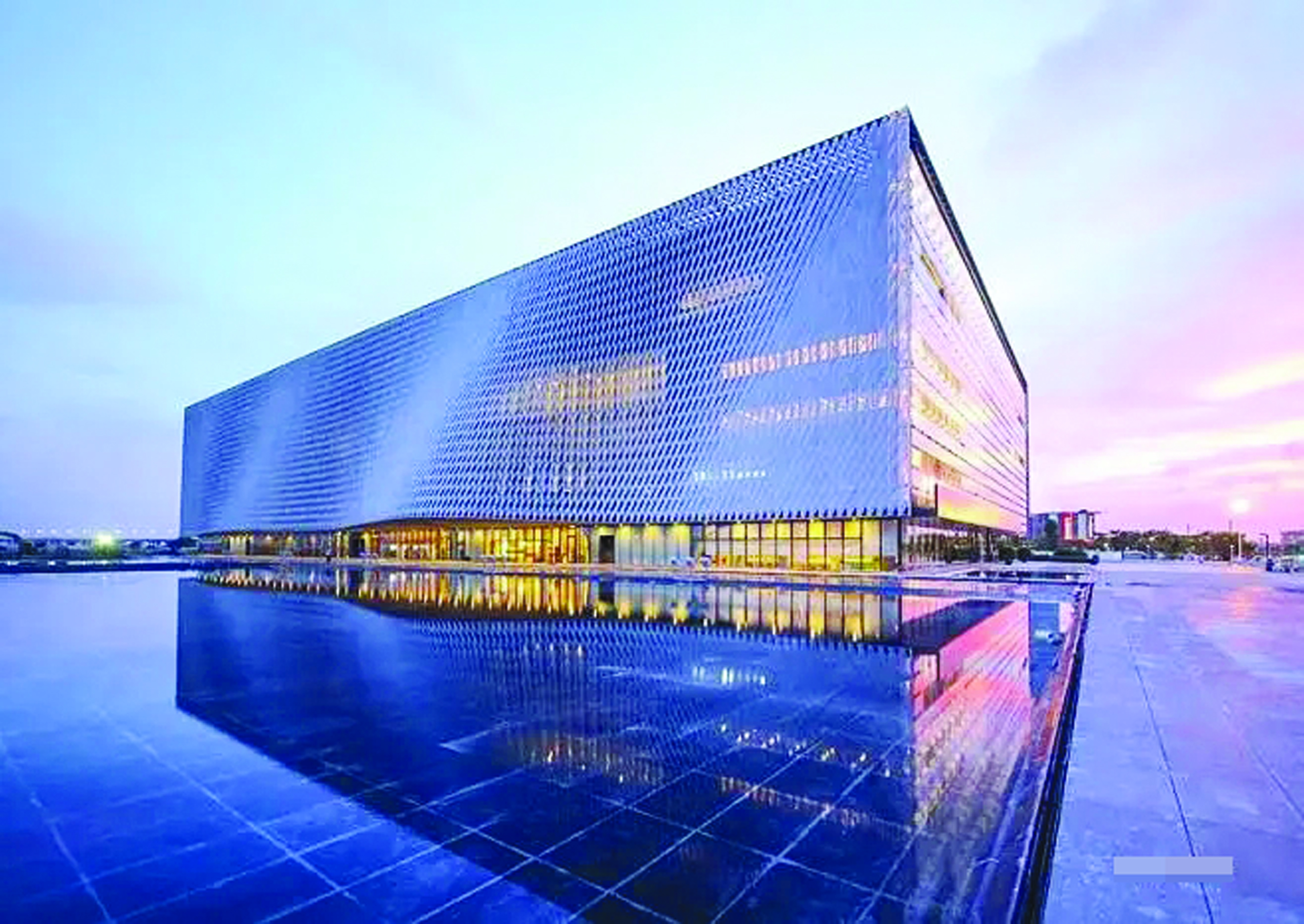 심수는 바쁜 도시이다. 바쁜 와중에도 고요한 곳이 있다. 바로 보안구 도서관이다. 사각형의 관형 설계는 군자의 행동거지와 같이 심플하고 단정하다. 외부에 련못이 둘러싸여있어 멀리서 보면 마치 물 우에 앉아있는 것 같다.