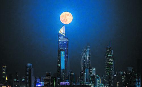 사진은 7일 쿠웨이트 수도 쿠웨이트시에서 촬영한 밝은 보름달과 현대 건출물들이 어우러진 모습이다. 신화사