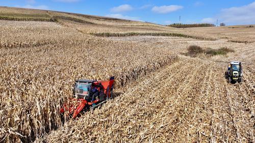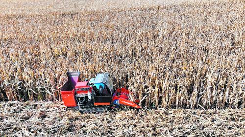 14일, 연길시 조양천진 근로촌에서 수확기가 분주히 오가며 옥수수를 수확하고 있다. 현재 우리 주 각 현(시)에서는 기계화 작업으로 옥수수가을을 속속 시작하고 있다. 리계화 기자