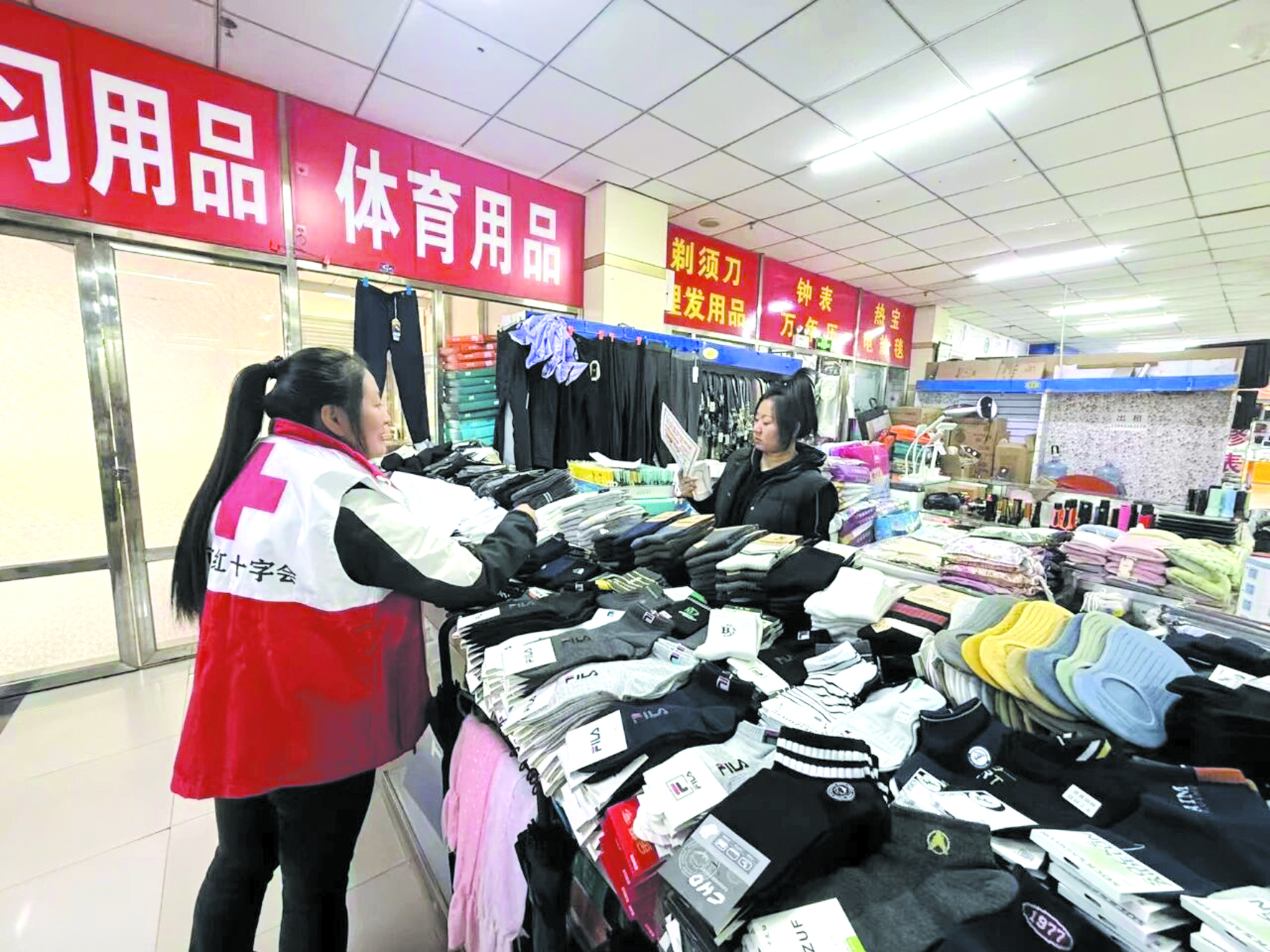 상인들에게 응급구조에 대해 선전하는 화룡시적십자회 사업일군.