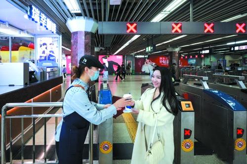 10월 31일, 북경 지하철역내 첫 커피숍이 1호선 국제무역역에서 정식으로 운영에 들어갔다. 승객들은 지하철역에 들어가기 전이나 승차중에 핸드폰 프로그램을 통해 미리 주문한 후 가게에 가 수령하면 된다. 사진은 미리 사전에 온라인으로 커피를 주문한 승객이 바로 커피를 받는 장면이다. 중국신문넷