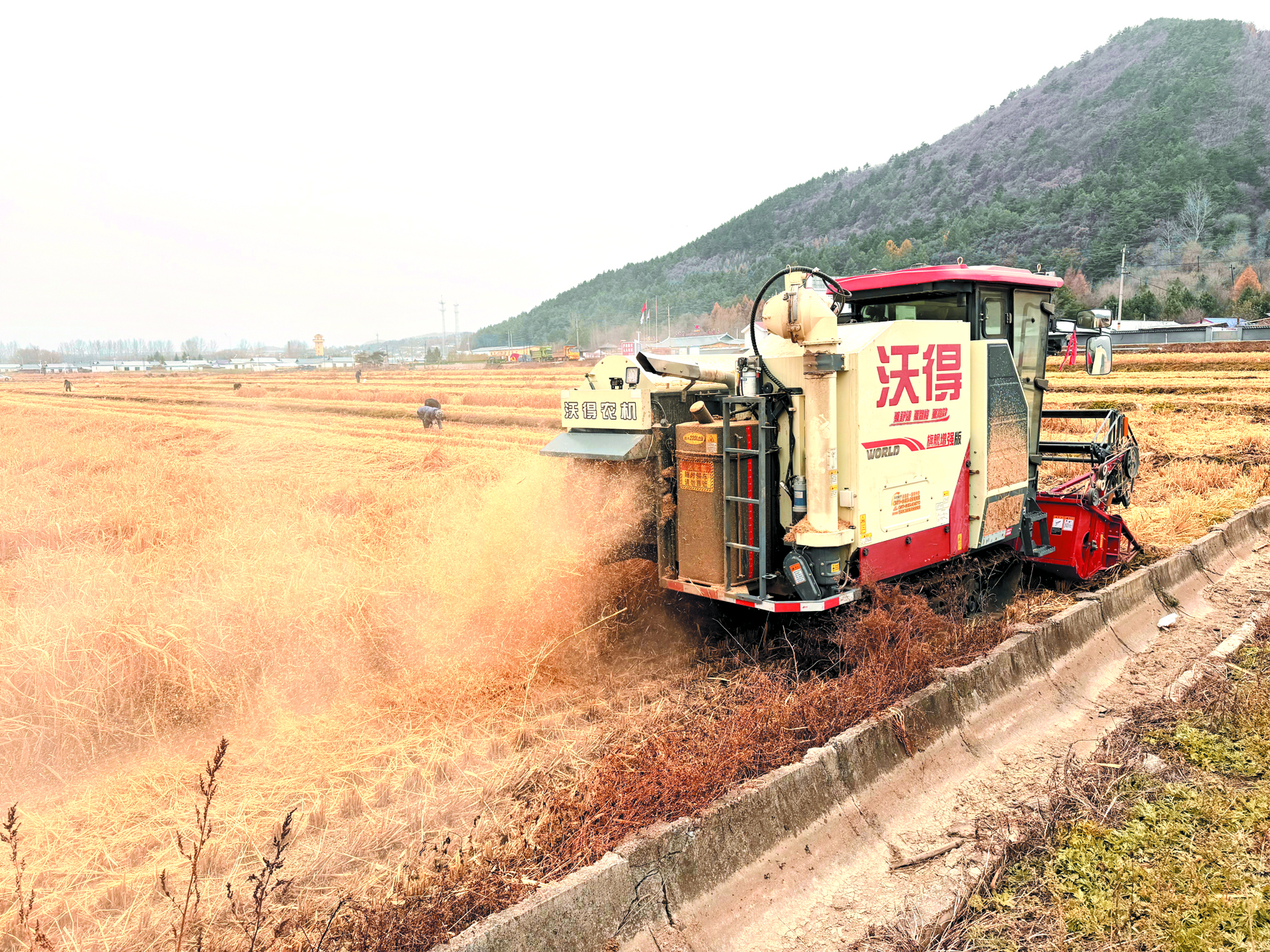 10월 29일, 도문시 월청진 마패촌의 아득히 펼쳐진 황금빛 벼바다에서 벼수확기가 논배미를 넘나들면서 분주히 움직이고 있다. 기계의 움직임에 따라 벼는 곡물창에 들어가 벼알로 남고 짚대는 갈아져서 논에 분출된다. 곡물창에 낟알이 차면 길에 세워진 농용 뜨락또르 옆으로 가서 차바구니에 부리우는데 운송관에서 살찐 황금색 벼알들이 련속으로 쏟아져나온다. 한편 촌민들은 주머니, 통을 들고 기계가 수확을 마친 논배미에 들어가 루락된 낟알들을 말끔히 주어담는다.