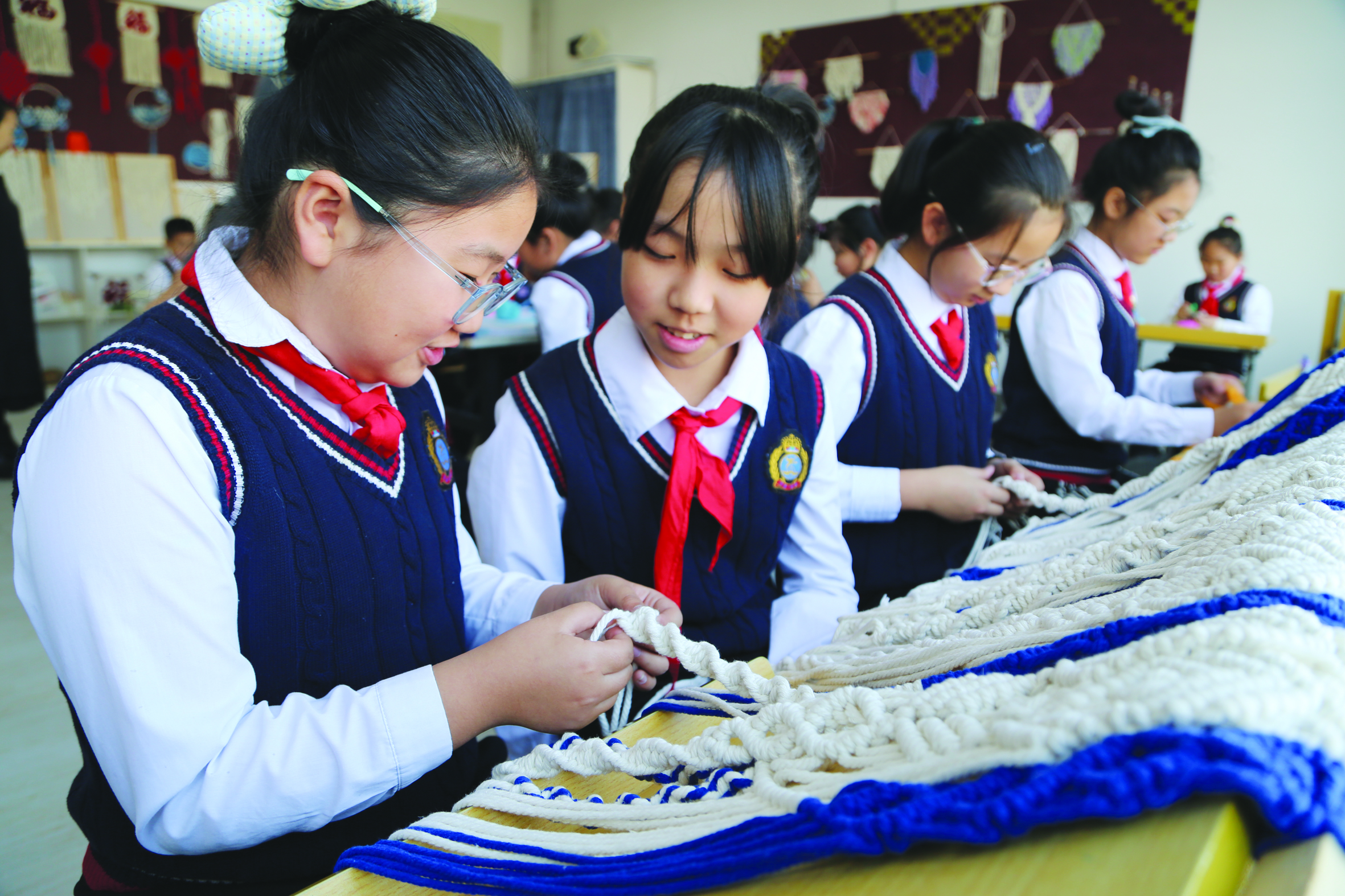 5일, 왕청현제1실험소학교의 매듭예술 활동교실, 오색찬란한 여러 빛갈의 끈들이 빠르게 움직이는 학생들의 손끝에서 한떨기의 꽃으로, 한그루의 나무로, 한마리의 나비로 변해간다.