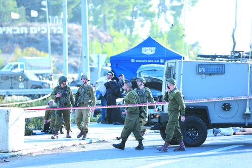 18일, 요르단강 서안의 한 길목에서 안전요원들이 공격 현장을 봉쇄하고 있다. 이스라엘 매체에 따르면 요르단강 서안에서 18일 차량 돌진 및 칼부림 공격이 발생해 최소 1명이 숨지고 3명이 다쳤으며 1명이 중상을 입었다. 신화사