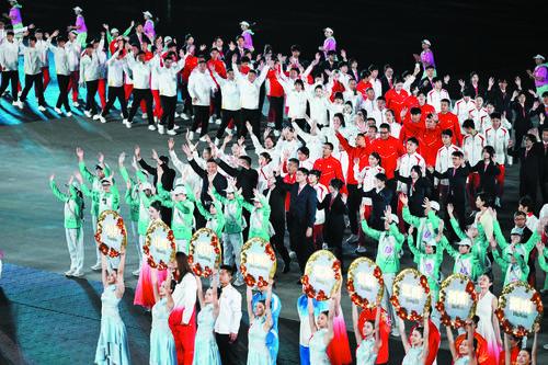 21일, 제15회 전국운동회 페막식이 광동 심수 전해환락극장에서 거행되였다. 사진은 참가팀 대표들이 페막식에서 입장하는 장면이다. 신화사