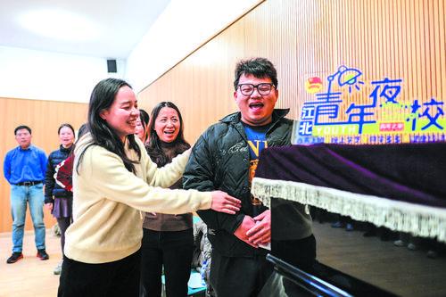 26일, 녕파시 강북청소년활동쎈터에서 교원(왼쪽)이 청년야간학교의 성악수업에서 수강생들을 지도하고 있다. 2024년부터 공청단 녕파시 강북구위원회는 대학교, 병원, 변호사사무소 등 기업, 사업단위의 자원을 통합하여 ‘강북청년야간학교’ 프로젝트를 내오고 ‘청년 주문, 정부 제작, 야간학교 주문 접수’의 운영모식을 통해 청년들에게 기능학습 기회를 제공함과 동시에 그들의 야간 여가생활을 풍부히 했다. 현재 이 학교는 이미 7기를 운영했으며 외국어, 무용, 음악, 복장 디자인 등 수업을 개설하여 루계로 9600여명 청년수강생에게 봉사를 제공했다. 신화사