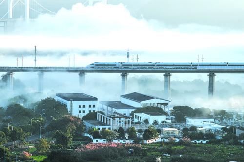 28일, 고속렬차가 반흥고속철도 북환선 특대대교를 지나고 있다. 이날 귀주 반주-흥의 고속철도가 정식으로 개통되여 귀주성이 성내 각 시, 주 중심도시들이 고속철도권에 들어섰음을 알렸다. 반흥고석철도 길이는 약 99킬로메터, 설계시속은 250킬로메터이다. 신화사