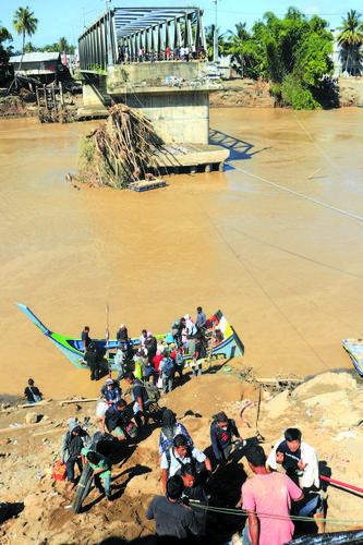 11월 30일, 인도네시아 아체주 메룬지역에서 사람들이 배를 타고 강을 건너고 있다. 1일, 인도네시아 국가재해방지청은 홍수재해와 산사태로 502명이 조난당하고 508명이 실종되였다고 통보했다. 신화사