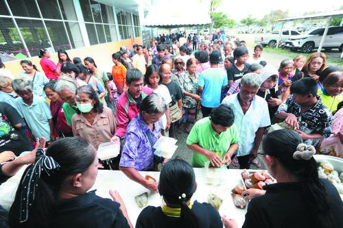 10일, 타이 민중들이 한 대피소에서 줄을 지어 식품을 수령하고 있다. 타이 공중보건부는 9일 타이─캄보쟈 국경지역 7개 주의 19개 병원과 167개 지역사회 위생쎈터가 페쇄됐으며 정부는 총 619개의 대피소를 개방하고 14만 7050명을 수용했다고 밝혔다. 신화사