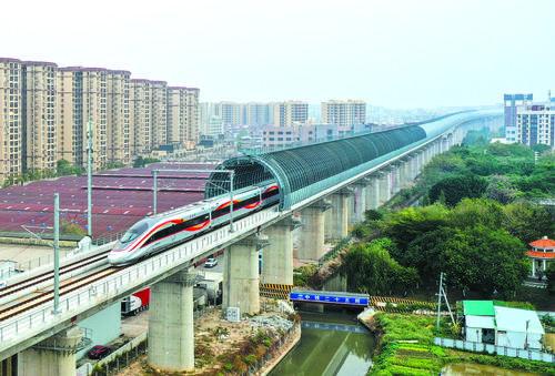 22일, 광주 백운역에서 잠강북역으로 가는 렬차가 고중립교특대교 ‘방음턴넬’을 통과하고 있다. 이날 광주─잠강 고속철도가 개통되여 운영되였는데 광주 백운역─잠강북역은 빠르면 1시간 32분에 도달할 수 있다. 신화사