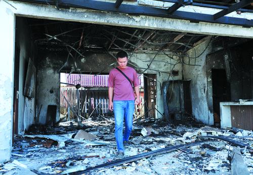 29일, 타이와 캄보쟈 변경지역에서 주민 1명이 폭격으로 파손된 주택을 살펴보고 있다. 타이와 캄보쟈는 27일 공동성명을 발표하고 이날 12시부터 휴전을 실시한다고 약속했다. 신화사