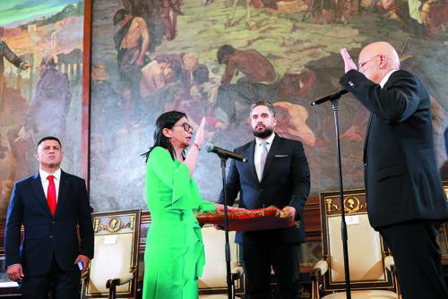 5일 오후, 델시 로드리게스가 베네수엘라 전국대표대회에서 림시대통령 취임 선서를 하고 있다. 로드리게스는 베네수엘라 부통령인 동시에 석유장관을 겸임했었다.신화사