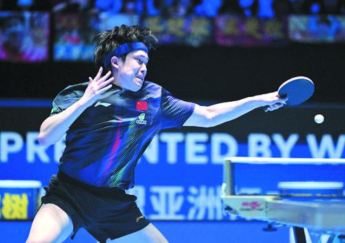 8일, 제35회 국제탁구련맹-아시아탁구련맹 아시안컵 탁구경기 남자단식 결승에서 중국 선수 왕촉흠은 일본 선수 하리모토 토모카즈를 4대2로 제압하고 우승을 차지했다. 사진은 왕촉흠의 경기 장면이다.