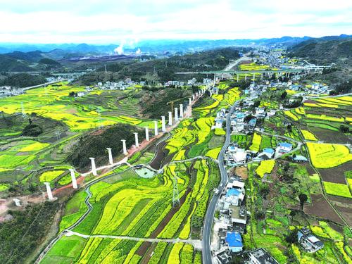 최근 중국철도 귀주공사유한회사에서 도맡아 건설한 옹마철도 갑자전특대교 주체공사가 마무리되였다. 옹마철도가 준공되면 향후 귀주성 지역철도망의 배치를 한층 더 최적화하고 검북물류집산의 능률을 높임으로써 지역경제 협동의 고품질 발전을 추동하게 된다. 사진은 2월 28일 옹마철도 갑자전특대교의 모습을 드론으로 내려다봤다. 신화사