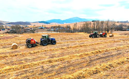 짚대반출은 봄갈이 준비 작업의 핵심단계이다. 최근 우리 주 각 지역에서는 짚대반출 작업을 빠르게 추진하며 봄갈이 준비를 하고 있다. 사진은 2월 28일 룡정시 덕신향 남양촌의 드넓은 들판에서 짚대 포장기가 한창 바삐 작업하는 현장 모습이다. 김유미 기자