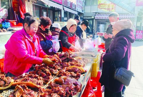 음력 2월 2일에는 돼지머리 고기를 먹는 민간풍습이 있다. 사진은 20일 연길시동시장에서 돼지머리 고기를 구매하는 시민들의 모습니다. 강내함 기자
