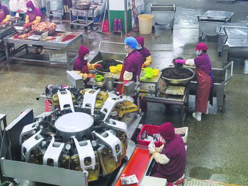 공장구역에 들어서니 깨끗하고 정연한 현대화 공장건물이 눈에 들어왔다. 참관창을 통해 살펴보니 깨끗하게 정비된 작업장에서 생산라인이 고능률적으로 운행되고 자동화설비가 질서 있게 작업하고 있었다. 로동자들은 통일된 작업복을 입고 마스크와 방호모를 착용하고 각자의 위치에서 규범적으로 조작하고 있었는데 원료 세척, 절임 발효로부터 주입 봉인, 포장 입고에 이르기까지 절차마다 모두 표준화 관리통제하에서 정밀하게 추진되고 있었다.