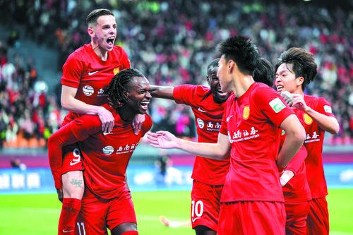 21일, 중경에서 있은 2026 시즌 중국축구슈퍼리그 제3라운드 경기에서 중경동량룡팀이 홈장에서 3대3으로 성도용성팀과 비겼다. 사진은 중경동량룡팀 선수들이 득점을 경축하는 장면이다. 신화사