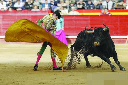 19일, 에스빠냐 동부 발렌시아에서 열린 ‘팔라스축제의 틀 안’에서 에스빠냐 투우사 에밀리오 데 유스토가 첫 소를 상대하고 있다. 외신
