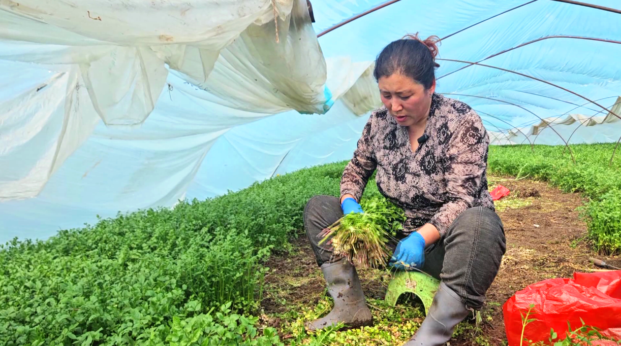 봄빛이 완연한 안도현 명월진 광흥촌, 멀리서 바라보니 온실하우스가 해빛을 받아 은빛으로 반짝인다. 온실하우스에 들어서니 버들쑥(柳蒿芽) 등 산나물이 푸르싱싱한 자람새를 자랑하고 있었다. 촌민들은 쭈그려 앉은 채 날렵한 칼솜씨로 산나물을 따 광주리에 담고 있었다.