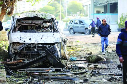 1일, 레바논 바이루트 남부 제나흐지역에서 사람들이 볼품없이 파괴된 차량 옆을 지나가고 있다. 레바논 보건부는 이스라엘이 1일 새벽 제나흐지역을 공습했으며 5명이 사망하고 21명이 다쳤다고 발표했다. 신화사