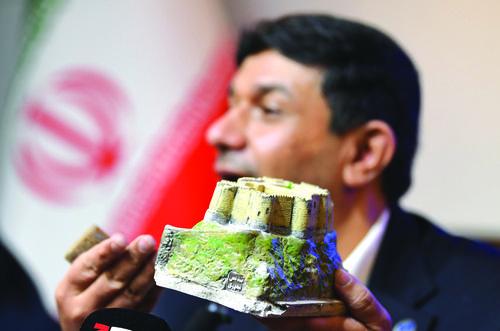 3월 31일, 이란 수도 테헤란에서 이란 관원이 이란 유적지 모형을 들고 기자회견에 참석하고 있다. 이 관원은 미국과 이스라엘의 공격으로 이란의 력사 유적지와 문화유산이 심각한 파괴를 입었다고 밝혔다. 신화사