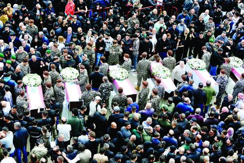 11일, 레바논 시돈시에서 사람들이 이스라엘군의 공습으로 사망한 보안요원들의 장례식에 참석하고 있다. 레바논 국가안보총국은 10일 성명을 통해 이스라엘이 당일 남부도시 나바티예의 정부청사에 공습을 가해 13명의 보안요원이 사망했다고 밝혔다. 신화사