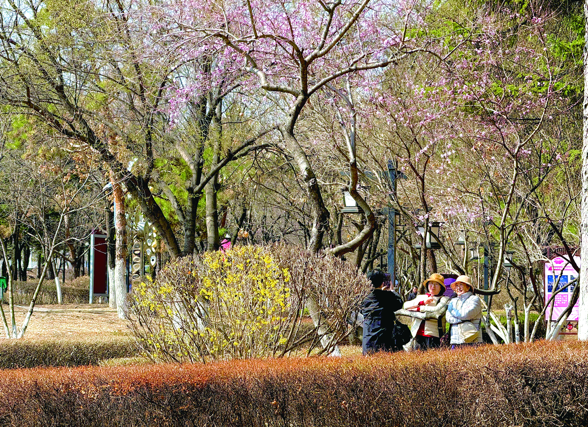 2일, 시민들이 연길공원 산책로를 따라 산책하면서 포근한 봄해살을 즐기고 있다. 김유미 기자