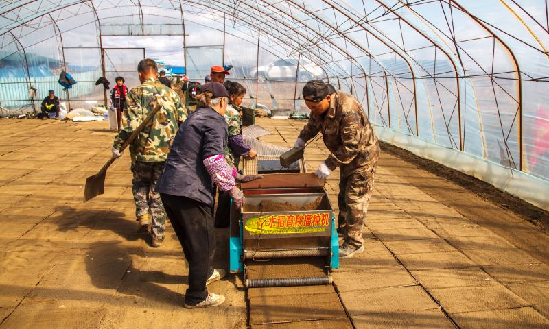 11일, 훈춘시 하다문향 삼림산재배전문농장의 비닐하우스에서 육모판에 벼씨를 붓는 작업이 펼쳐졌다. 10여명의 촌민들로 구성된 작업대가 육모판내림기로 빠르게 작업을 이어가고 있었다.