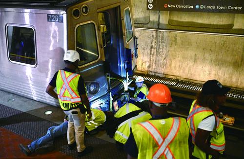 22일, 미국 수도 워싱톤의 지하철 중심역에서 교통국 직원들이 충돌사고가 발생한 지하철을 점검하고 있다. 이날 새벽, 워싱톤에서 공사차량이 역에 정차한 지하철 렬차와 충돌하는 사고가 발생해 11명이 부상을 입었다. 신화사