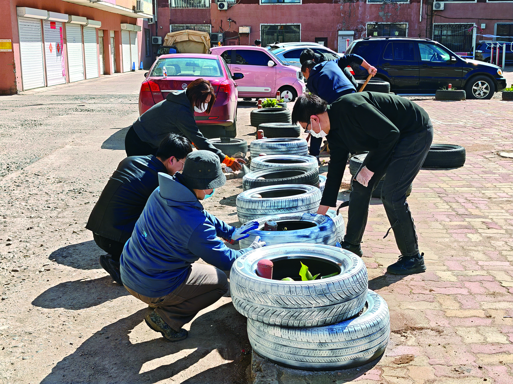 자원봉사자 장옥수는 다채로운 색으로 칠해진 타이어를 정성스럽게 쌓아 올리며 말했다. “버려진 페타이어를 개조하여 화초를 심었습니다. 생기 있게 자라날 모습이 기대됩니다.”고 뿌듯해했다.