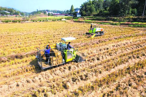 호남성 장사시 장사현은 짚대의 사료화, 기초재료화, 비료화 등을 방향으로 자원화한 리용을 전개하며 페기물이였던 짚대를 보물로 전환시키는 동시에 환경도 보호하고 있다. 현재까지 현지에서는 짚대수거저장운수쎈터 두개와 수거저장점 17개를 구축하며 짚대의 ‘근처 수거와 근처 전환’을 실현했다. 사진은 5일 장사현 개혜진 개혜촌에서 자동화 설비를 동원해 벼짚을 수거하는 모습이다.