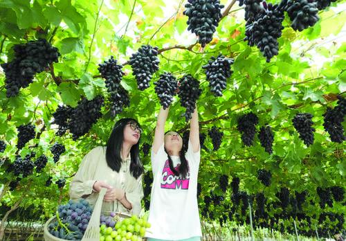 최근년간 하북성 창려현은 전통 포도재배산업에 의거하여 고품질 포도 재배장원, 가정농장을 육성하고 채취, 관광, 체험을 일체화한 향촌관광의 신업태를 구축함으로써 농민 소득 증대를 촉진하였다. 사진은 얼마 전 관광객들이 창려현 십리포향 경장촌 람활장원에서 포도를 따는 모습이다.