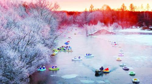 안도현 이도백하진의 무송도, 겨울 래프팅으로 이곳의 특별한 정취를 느끼려는 관광객들의 발길이 이어지고 있다. 사진은 26일 노을빛에 물든 무송도에서 북국의 매력을 만긱하는 관광객들의 모습이다.