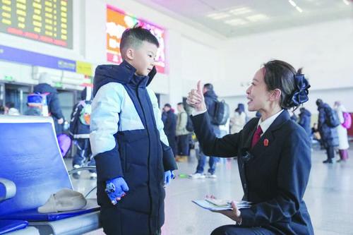 돈화시인민법원에서는 연변철도공안처 돈화역파출소와 손잡고 돈화기차역에서 알기 쉬운 언어로 려객들에게 헌법 기본지식을 해석했다. 사진은 9일 돈화시인민법원 일군이 꼬마려객에게 법률지식을 전수하는 장면이다.