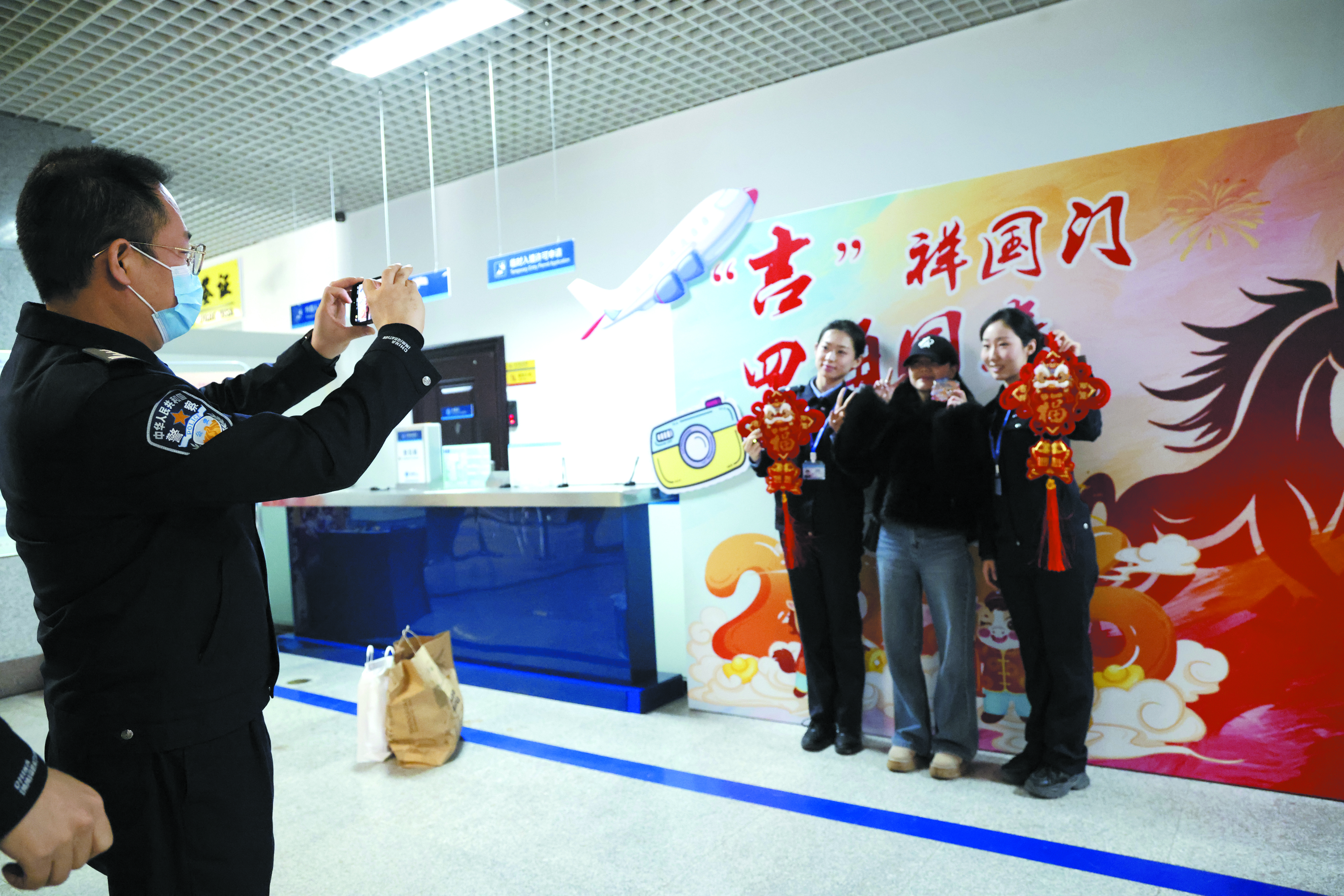 음력설을 하루 앞둔 16일 오전, 연길조양천국제공항 입국검사 대청에는 눈에 확 띄는 붉은색의 ‘복’자와 정교한 명절 장식품들이 경사스러운 명절 분위기를 한껏 연출하면서 관광객들을 반갑게 맞이했다. 음력설을 맞아 이민경찰들은 관광객들을 위해 특별히 포토존까지 설치했고 입국 검사를 기다리는 관광객들 저마다 음력설 명절 특색이 다분한 포토존에서 기념촬영을 하면서 아늑한 명절 분위기를 마음껏 즐겼다.