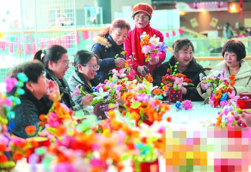 최근 산동성 영성시 석도관리구 대어도사회구역문화관에서 새봄맞이 꽃꽂이 활동이 펼쳐졌다. 사진은 지원자들이 로인들과 함께 꽃꽂이를 하고 있는 모습이다.