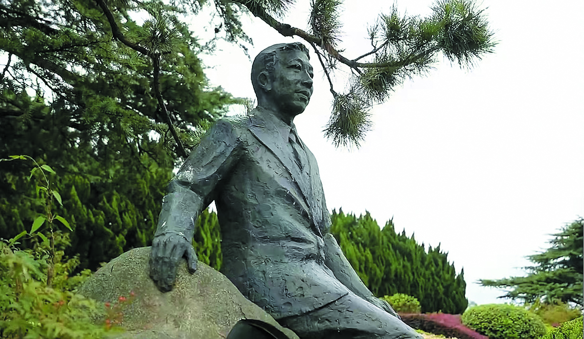 안휘성 합비시 촉산렬사릉원의 푸른 소나무와 측백나무 사이에 청동 조각상이 조용히 서있다.