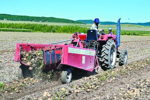 돈화시 대교향 하연촌의 규모화 감자 재배호 척보동이 감자풍년을 맞이했다. 올해 그가 재배한 품종은 연변주농업과학원에서 2021년 개발한 연서13호로 알이 굵고 식감이 좋아 소비자들로부터 환영받고 있다. 그는 올해 10헥타르 감자밭의 생산액이 40만원에 달할 것으로 내다보고 있다. 사진은 18일에 촬영한 수확현장의 모습이다.