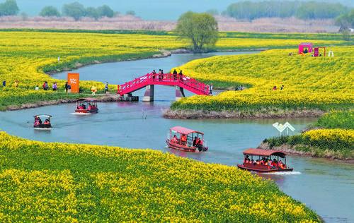 강소성 고유시 호상화해풍경구에서 관광객들이 유람선을 타고 꽃을 감상하고 있는 모습이다.