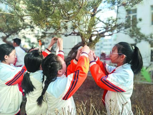 12일, 마흔여덟번째 식수절을 맞아 우리 주 교육부문에서는 형식이 참신하고 내용이 다채로운 주제교육 활동을 펼쳐 광범한 청소년들이 생태실천에 적극 참가하도록 이끌었다. 사진은 연길시북산소학교 학생들이 나무를 장식하고 있는 모습이다.