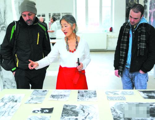 현지시간으로 19일, 벨지끄 캄브레국가고등시각예술학교는 브류쎌에서 중국 수묵화 선택과목의 기말평가를 마련하고 학생들의 중국 수묵예술 연구 결과물을 전시했다. 사진은 수업 지도교원(가운데)이 방문객들에게 학생들의 수묵화 작품을 소개하는 모습이다.