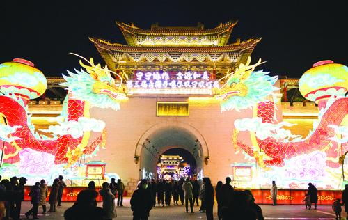2일, 사람들이 청해성 서녕시 황원현 단가르고성에서 꽃등을 감상하고 있다. 양력설련휴기간에 사람들은 각양각색의 방식으로 휴식을 취하며 즐거운 시간을 보냈다.