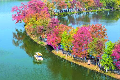 2일, 관광객들이 강소 남경 중산식물원 월아제방에서 가을정취를 만긱하고 있다.