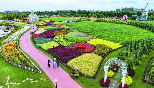 19일, 관광객들이 강소성 염성시 대풍구 화란꽃바다풍경구내에서 꽃을 감상하며 즐거운 시간을 보내고 있다.