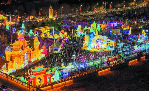 20일, 내몽골 흥안맹 호르친우익전기 금수카니발 설맞이 등불회가 개막되여 수많은 주민들과 관광객들이 등불구경을 위해 몰려들었다. 사진은 20일 관광객들이 등불회에서 등불을 구경하는 모습이다.