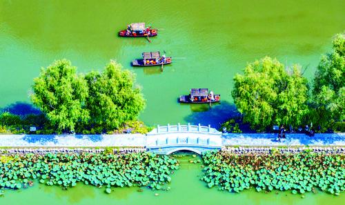 7일, 관광객들이 강소 흥화 리하하 국가습지공원에서 배를 타고 놀고 있다. 국경절과 추석 련휴가 막바지에 접어들었음에도 불구하고 각지 관광객들의 관광 열기가 여전히 뜨거웠다. 이들은 아름다운 경치를 감상하고 맛있는 음식을 맛보며 휴가를 즐겼다. 신화사