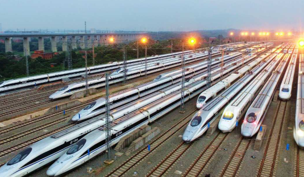 1일, 중국국가철도서안국 서안동력차량구간 차고내 고속렬차들이 정연하게 주차되여있다. 음력설운수가 곧 시작될 무렵 중국국가철도서안국그룹유한회사 서안동력차량구간에서 고속렬차들이 출발을 기다리고 있다.