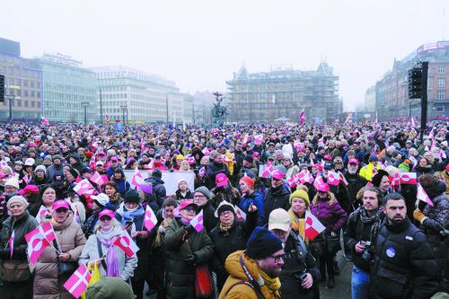 17일, 단마르크 수도 쾨뻰하븐의 시정부 광장에서 사람들이 시위에 참가하고 있다. 그린란드를 차지하려는 미국의 시도에 항의하는 이날 시위에는 수천명에 달하는 시민들이 참여했다.