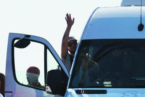 13일, 석방된 이스라엘 억류자 1명이 환영인파를 향해 손을 흔들어 인사하고 있다.